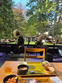 Surrounded by forest, the restaurant offers seasonal views from its floor-to-ceiling windows.