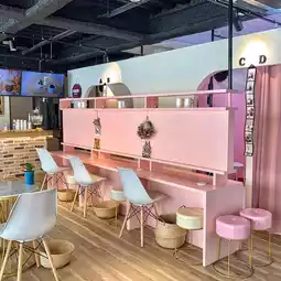 The cafe has this super cute, Instagram-worthy vibe, with pastel-colored decor and a relaxed atmosphere.