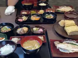 Freshly cooked rice, miso soup, and side dishes made with seasonal Shinshu vegetables were served.