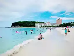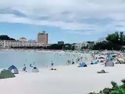 Shirarahama is a beach famous for its white quartz sand and hot springs. It has a friendly relationship with Waikiki Beach in Hawaii, and its beauty is well-known. Although the official swimming season starts next week, the beach was already bustling with many people, giving a sense of the arrival of summer.