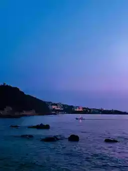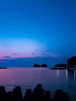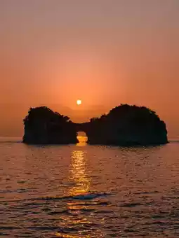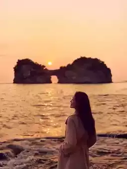 Walking along the winding coastline, the sea breeze carried the unique salty smell of the ocean, gently tugging at my hair. From a distance, I could see Engetsu Island standing quietly between the sea and the sky, gently surrounded by clear water. Soon, the setting sun's rays pierced through the clouds, giving Engetsu Island a golden edge. The sky turned orange-red, and the sun quickly sank, turning the sky and sea into a golden world.