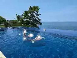 The pool is an infinity pool that blends seamlessly with the Pacific Ocean below.