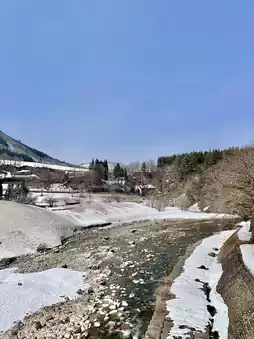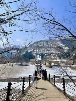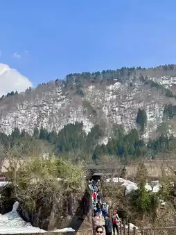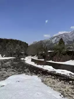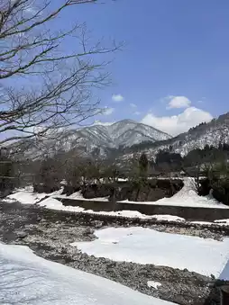 I have been to Shirakawa-go once before in winter, and all I remember was small cottages covered in snow! This time I found that there is a beautiful river further away, which is clear and transparent blue-green 🩵✨ Walking to the bridge, there are magnificent mountains. At that time, it was still a snowy mountain with many withered tree trunks, which was very spectacular 🏔️