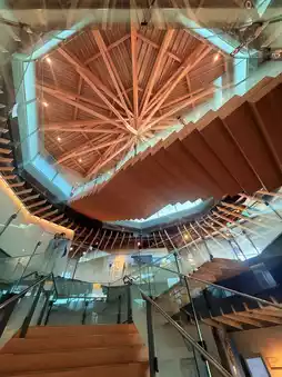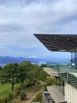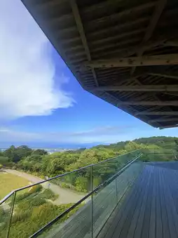 Let's start with the Nihondaira Dream Terrace, a public space designed by renowned Japanese architect Kengo Kuma and opened in 2018. The structure extensively uses Shizuoka wood, and staff explain that its design was inspired by the Yumedono Hall of Horyuji Temple. This influence is evident in the frequent use of octagonal shapes throughout the design, from the main building to the extended wooden walkway viewing area and the outer observation deck.