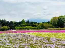 • The breathtaking view of over 500,000 moss phlox (shibazakura) flowers in vibrant shades of pink, light pink, purple, and white, beautifully arranged across a vast 2.4-hectare area. The contrast with the blue skies and Mount Fuji in the background is a true visual masterpiece.