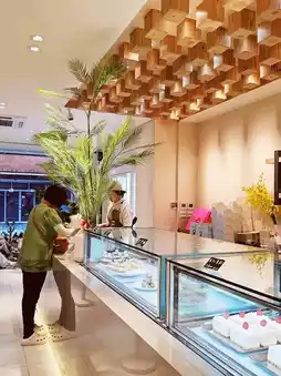 The shop includes a bright hand-brewed coffee bar and a cozy sofa area, making it perfect for dining in, snapping photos, or simply unwinding. Both the desserts and the space are irresistibly photogenic.