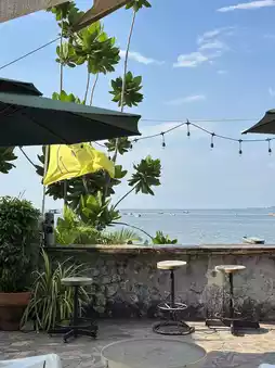 But it's small. The atmosphere is chill. It's a bit hot, but I can sit and enjoy it. The beach is not very beautiful. It is a fishing area • 4/5 points, delicious food, chic shop • There is a parking lot and a 100-meter walk