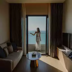 🛌 The One Bed Rm Suite was our accommodation on this trip. The room is well-proportioned, divided into a living room area with a sofa set, a balcony, and complete amenities, including a washing machine. The bedroom has a walk-in closet and a large bed, which is the highlight of this place. We can see a 180-degree sea view from every room. 🌅