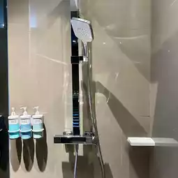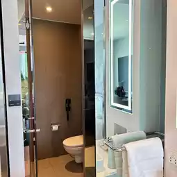A large bed, comfortable water pressure, the bathroom door is slightly close to each other between the shower room and the toilet.