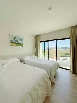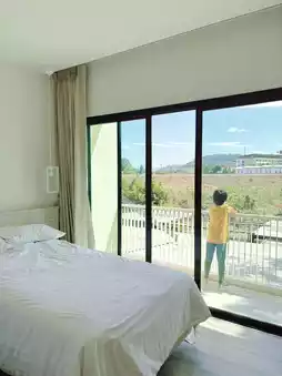 The view behind the hotel is the view of the train tracks. The ground floor has a swimming pool and a fitness center. In front of the hotel, there is a restaurant and a cafe. Or if you want to eat something in the Sriracha area, you can order through Grab or Lineman.