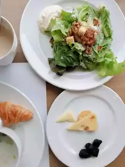 - Breakfast at the hotel is diverse and delicious, served in a glass-walled dining area with sea views.