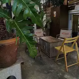 On a holiday morning, the sunlight shines onto a two-story wooden house full of trees. Friends come to pick you up in front of the open space. You can find a seat right away. It's not hot and it's not chaotic. There is a cool air-conditioned area and a shady outdoor garden. Cute vintage style like a friend's house
