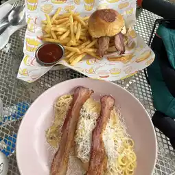 A cafe that I love. Delicious food and drinks, good prices, by the sea, great view. When you enter, there is a parking lot, but you have to walk about 50 meters following the sign to find the shop. The shop has a famous pizza menu and a Carbonara burger that bakes bacon for 6 hours. There is an air-conditioned shop, which is a cafe with 1-2 tables and a cool photo corner overlooking the sea. The outdoor area is an open-air table to catch the sea breeze. There are many tables. There is a bar to sit and look at the sea. I recommend coming in the afternoon to sit comfortably and not hot.