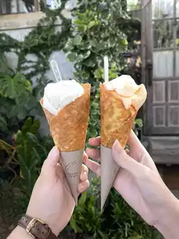 They offer a wide variety of ice cream flavors, which rotate daily. The ice cream is thick and rich, but I personally don't think it's particularly impressive. It's okay, but it's average. What I liked was the aroma of the desserts when I opened the door. It's probably the smell of waffle cones being baked. If you're in Sri Racha, stop by and give it a try! 😆