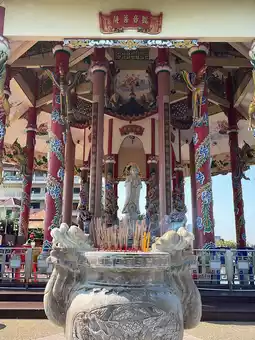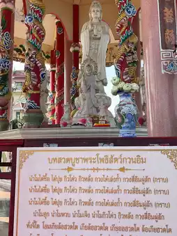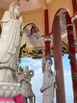 Worshiping Guanyin during the festival brings in a larger crowd than usual. You can clearly see the sea view from the shrine. Guanyin faces the pier where tourists board boats to Koh Sichang, a wonderful way to offer blessings to tourists. Let's head in.