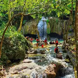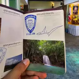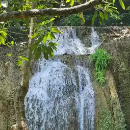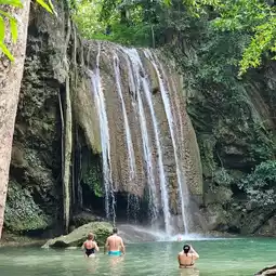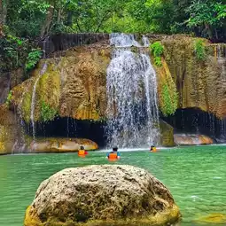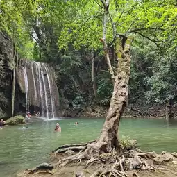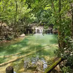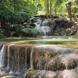 🌏 Erawan Waterfall is located in Erawan National Park, Kanchanaburi Province. It is a very large and beautiful waterfall and is famous all over the world. Many foreign tourists come here. The waterfall has 7 levels in total, each level is beautiful and different. It is shady with various types of trees. The waterfall has crystal clear water for swimming. You can also see fish swimming under the water that reflects emerald blue-green light. When the light shines down, it reflects blue, emerald green, very beautiful. Tourists can swim in many levels. The best recommendations are levels 2 and 3, there will be a lot of people swimming. Most importantly, you must wear a life jacket every time before swimming. If you don't have a life jacket, the park has them for rent at a price of 20 baht all day. If tourists want to see all 7 levels of the waterfall, they should have at least 1 full day because you have to walk to level 7, about 2,000 meters from the park office. The path is uphill all the way. You can only bring 1 bottle of water. You cannot bring food in. There is a 20 baht deposit for bottles as a precaution and Preserve the beauty of nature