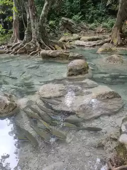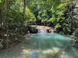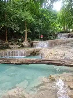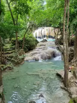 Erawan Waterfall is an unseen that is worth visiting. It is beautiful with 7 levels of waterfalls. The higher you walk, the more beautiful it is. It is clear and inviting. The atmosphere is good throughout the journey. However, there are quite a few people. The toilets are clean. The entrance fee is 60 baht per person and 30 baht for a car. There is a field where you can contact to set up a tent. There are many restaurants along the way. The parking lot is spacious. Currently, there is a golf cart that will take you to the waterfall so you don't have to walk until you are tired. It is very beautiful and natural, which is great for those who love hiking and taking pictures.