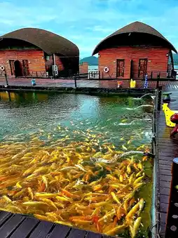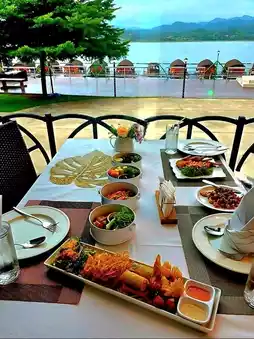 Leaf Lake Kan Resort is located in Si Sawat District, Kanchanaburi Province. The rooms are designed in the style of individual wooden raft houses with distinctive curved roofs, a Balinese style.