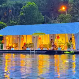 Relax and unwind on a floating raft near Erawan Waterfall, with mountain and river views. So close to nature! The atmosphere is peaceful and private. In the evening, go kayaking and relax. Feel free to immerse yourself in nature. Enjoy delicious food. It's the ultimate way to heal your heart! 🫶🏻