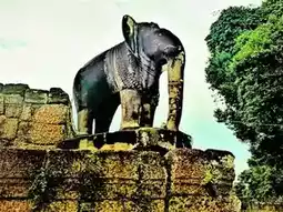 East Mebon follows the classic temple-mountain design, symbolizing Mount Meru, the cosmic axis of Hindu cosmology. Its five towers—arranged in a quincunx pattern—represent the mountain’s peaks, with the central tower housing the sacred lingam. Unlike later Angkorian temples adorned with intricate narratives, East Mebon’s sandstone and laterite structures emphasize geometric harmony. The temple’s three-tiered pyramid base, flanked by elephant statues at each corner, reflects both royal and divine authority. These life-sized stone elephants, along with guardian lions and Nandi bulls, serve as silent witnesses to the temple’s ceremonial past.