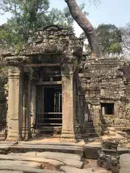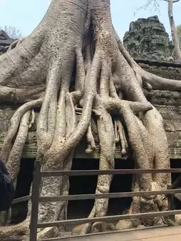 • The overwhelming presence of the "strangler fig" intertwined with stone walls