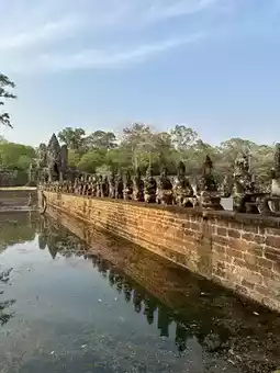 For the classic panoramic view over the entire park, make the climb up Phnom Bakheng hill ⛰️, but be sure to arrive early as numbers are limited. For a less crowded but equally magical experience where the temple's ancient reddish bricks glow in the evening light, head to the stunning Pre Rup temple 🧱. Alternatively, find a peaceful spot by the edge of Angkor Wat's vast moat, and watch the magnificent temple and the blazing sky reflect perfectly in the still water 💧.