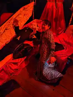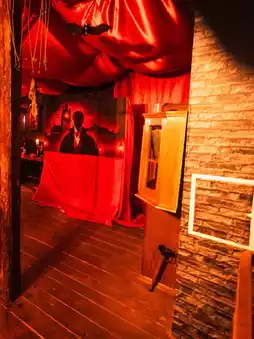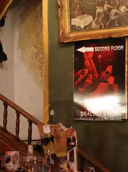 We asked him, and he pointed up to the third floor. The "Dracula Exhibition" requires a small admission fee. A narrow staircase leads up to a darkened room. The old wooden door creaks open...