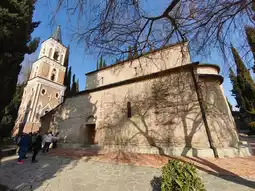 The monastery is situated amidst tall cypress trees on a steep hillside.
