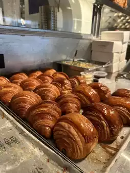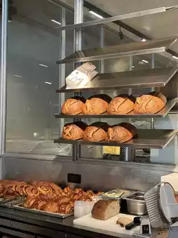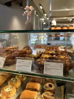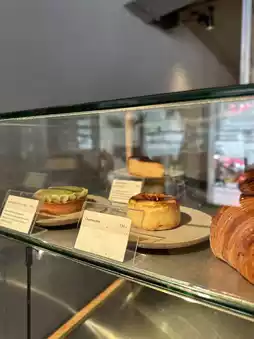 The counter bar and the semi-open kitchen at the back offer a view of the fragrant bakery kitchen in an open-air glass room, showcasing the bakers' delicious creations.