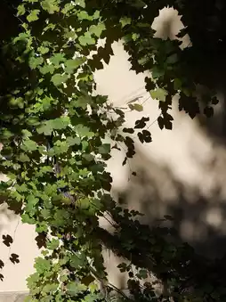 Behind the building is another wall, a cream-pink hue with a triangular pediment that matches the Roman numeral clock above the balcony.