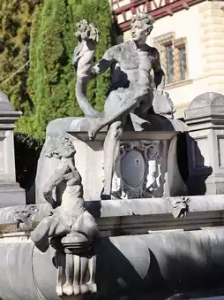 In the courtyard in front of the castle stands a marble fountain, surrounded by stone and bronze statues. The muscular lines, the erosion of the stone surface, and the tiny cracks bring them to life.