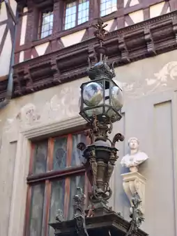 This courtyard is like the heart of Peleș—intricately carved Tudor woodwork, rows of stained glass, seemingly telling a silent story through light.