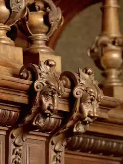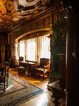 As we enter the library, we are greeted by over 10,000 books lined up on the shelves. The atmosphere is tranquil, yet each volume tells a story of the past. The walls and wooden pillars are intricately carved, especially the "Green Man," a medieval nature god carved into the moldings. This serves as a reminder that despite the luxurious palace, nature is always watching. This library reflects King Carol I's desire to make the castle a "home for readers," rather than simply a royal residence.