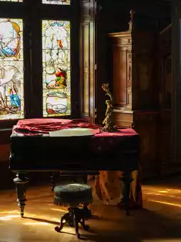 Continuing our walk, we find the chamber of Queen Elizabeth, also known by her pen name "Carmen Sylva." A wooden piano sits beside a stained glass window, illuminating the room with soft light, reflecting Queen Elizabeth's artistic side, both as a poet and translator. She transformed the living room into a stage for art and spirituality.