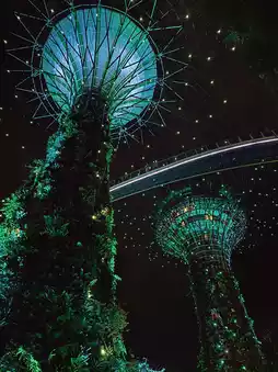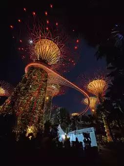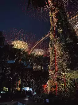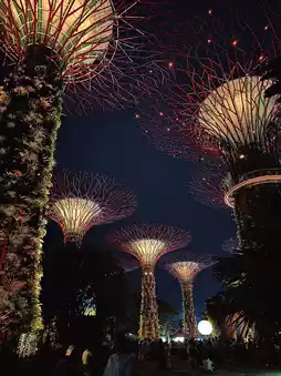 Supertree Grove 🌟 is the highlight of Gardens by the Bay that you must see with your own eyes! Towering futuristic giant trees with spectacular lights, especially the Garden Rhapsody show in the evening where the lights and music will surely amaze you 🎶🌌