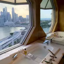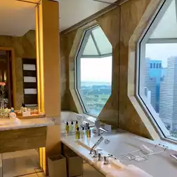 The moment I entered the grand lobby, I was awestruck by the opulent surroundings, featuring a stunning art collection and sleek architectural design. My room was a masterpiece of modern luxury, complete with panoramic floor-to-ceiling windows offering unparalleled views of Marina Bay and the city skyline. The spacious bathroom, with its iconic octagonal window overlooking the city, made every moment feel like pure indulgence, particularly during a relaxing soak in the oversized tub.
