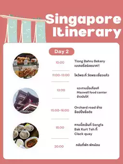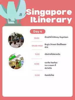 ☕️ Wake up and chill at Killiney Kopitiam, then go shopping for souvenirs at Bugis Street ✈️ Before boarding the plane, stop for llaollao Ice Cream to enjoy before flying back to Thailand.
