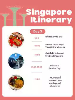 This trip is perfect for those who want to experience everything—eat, shop, and travel fully. Try authentic Singaporean dishes like Hainanese Chicken Rice, Bak Kut Teh, or Michelin-starred red pork noodles! Plus, there’s time to relax, take beautiful photos at important landmarks, and end with fun at Universal Studios 🏙️✨ No need to take many days off work to enjoy a full trip! If you’re planning a trip, try this plan!