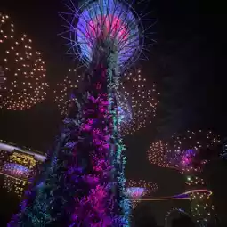 As night falls, the Supertrees light up in colorful lights, accompanied by melodious music, creating a spectacular scene. Find a spot on the lawn near the Supertrees, shoot portraits with the Supertrees as the background, and the lights reflecting on your face create a magical and charming effect—every shot looks like a dreamy masterpiece.