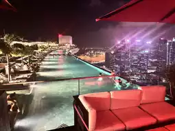 Luckily, a colleague who knows some English found a bar next door, CE LA VI SkyBar & Club Lounge, where you can enter for just 38 SGD and get a credit toward your consumption. The key point is that it actually has two areas. We stayed a long time in the first area, which was super crowded and hard to find a spot, but there were lots of beautiful people. Before leaving, we discovered another area next door with music—it’s part of the same space but fewer people come here. It’s connected to the Marina Bay Sands hotel pool, the view is amazing, and you can also see the water dance show.