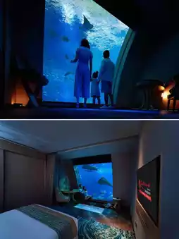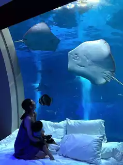 There are only 11 Yitho Underwater Suites, measuring 93 square meters, with a bedroom and living room on two levels. The upper level of the suite features an outdoor terrace and a living room with a jacuzzi, while the lower level features an underwater bedroom with 40,000 fish swimming in front of you. The underwater bedroom has a large window and a bathtub, allowing you to enjoy the underwater world while enjoying your bath time. You can also enjoy breakfast in your room, and a dedicated butler will be on hand to serve you during your stay. You can also enjoy a comfortable holiday with your children by taking a shuttle to Universal Studios, water parks, etc. 🏖️