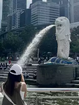 Next stop is the Merlion, the little lion spouting water, the country's mascot. Anyone coming to Singapore must stop by to take a photo with the water-spouting lion.