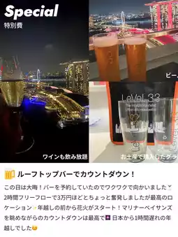 This time it was a New Year's trip! We had a reservation at a bar, so we went there excited🍸 We splurged a bit on a 2-hour free flow for about 30,000 yen, but the location was amazing✨ Fireworks started even before New Year's! Counting down while watching Marina Bay Sands was the best🎆 It was New Year's one hour later than Japan☺️