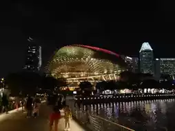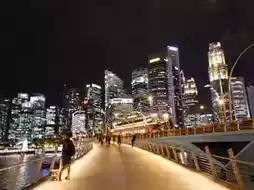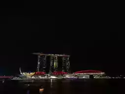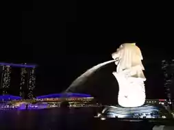 Arriving at the Merlion, tourists were still dense even though it was already evening. The lights were turned on, and there was a fountain show. The colors from the lights were spectacular and grand. It was fun and exciting, even though the weather was a bit hot.