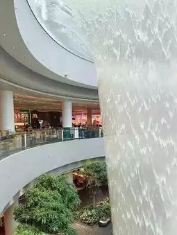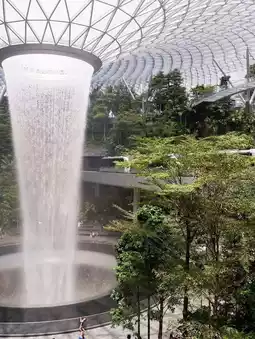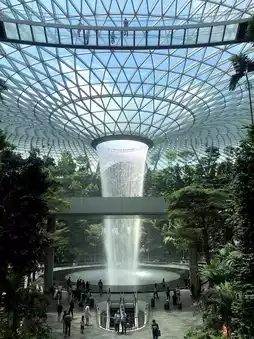 🌳 The waterfall is one of the highlights of Jewel Changi Airport. Its name is “HSBC Rain Vortex,” located at the center of the building. It is over 40 meters tall and is known as the tallest indoor waterfall in the world.