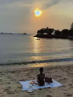 Tropical beach vibes with vibrant skies. Chill with friends or enjoy beach bars as the sun dips.