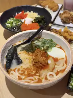 We went with the Spicy Tan Tan Tonkotsu Udon and the Spicy Tan Tan Ebiko Dry Udon. The Tonkotsu Udon came in a rich, spicy broth that was creamy with a good balance of heat. It’s topped with slices of chashu and an onsen egg with an oozing yolk — the kind of egg that blends right into the broth and makes everything more comforting.