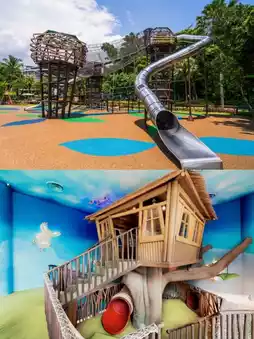 🏖 Rich facilities: Home to Sentosa's only private beach with fine sand and stunning sea views 🌊. The hotel also features two children's pools, water slides, and splash zones, making it a water playground paradise for kids 💦. Additionally, there is a kids' club, outdoor playground, double-decker treehouse, and more, allowing children to have endless fun while parents can relax on vacation 😉.