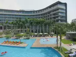 The hotel’s exterior perfectly blends with the surrounding palm trees and pool views, feeling like a living painting. The pool area is especially attractive, especially under the sunlight, with crystal-clear water—perfect for a refreshing swim. The lounge chairs and umbrellas nearby add to the relaxing vacation vibe.