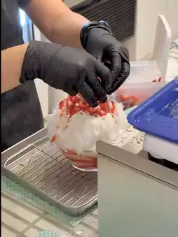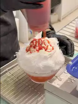 What really sets this kakigori apart, though, is the way it’s layered and flavored. Fresh, ripe strawberries are generously tucked into the icy layers, offering a natural sweetness and refreshing tartness that brightens up every spoonful. The strawberries’ juiciness contrasts wonderfully with the soft, snowy ice, making each bite a delightful experience.
